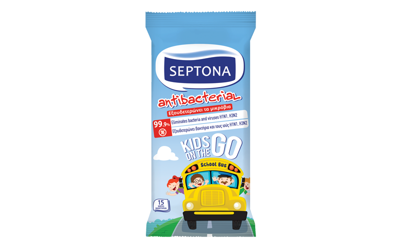 Τα παιδικά αντιβακτηριδιακά μαντήλια χεριών SEPTONA kids on the go εξουδετερώνουν τα μικρόβια και τους ιούς της γρίπης Η1Ν1 και Η3Ν2, χάρη στη σύνθεσή τους με αιθυλική αλκοόλη.
