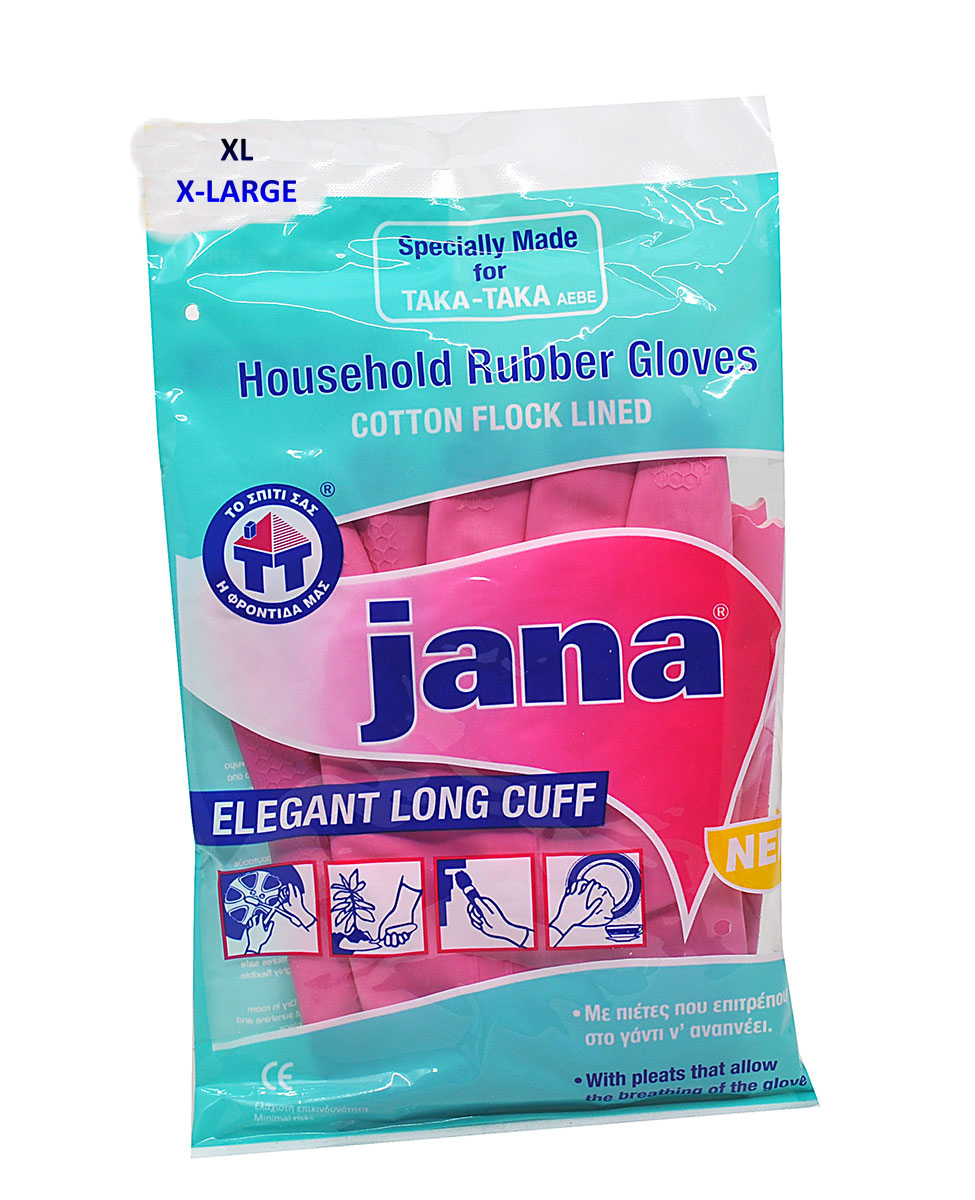 Γάντια κουζίνας - καθαριότητας JANA με φυσικό σχήμα παλάμης για καλύτερη εφαρμογή, κατάλληλα για όλες τις καθημερινές εργασίες στο σπίτι. Με ενισχυμένη επένδυση εσωτερικά που εμποδίζει την εφίδρωση της παλάμης και παράλληλα ενδυναμώνει την αντοχή του γαντιού.