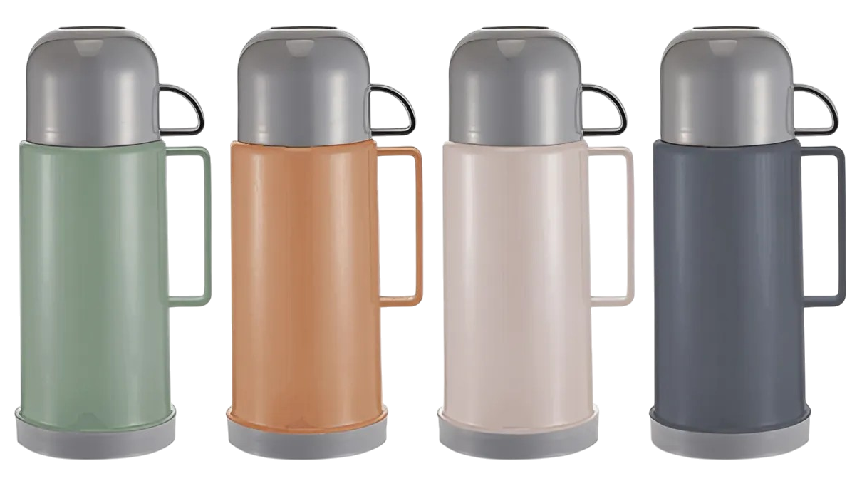 Θερμός πλαστικό με διπλό τοίχωμα και γυάλινη επένδυση για καλύτερα αποτελέσματα, με καπάκι με λαβή που μπορεί να χρησιμοποιηθεί και ως ποτήρι, σε τέσσερα χρώματα.